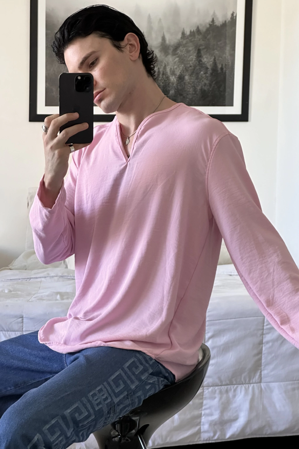Manga larga, corte suelto. En tela liviana parecida al crepe.
