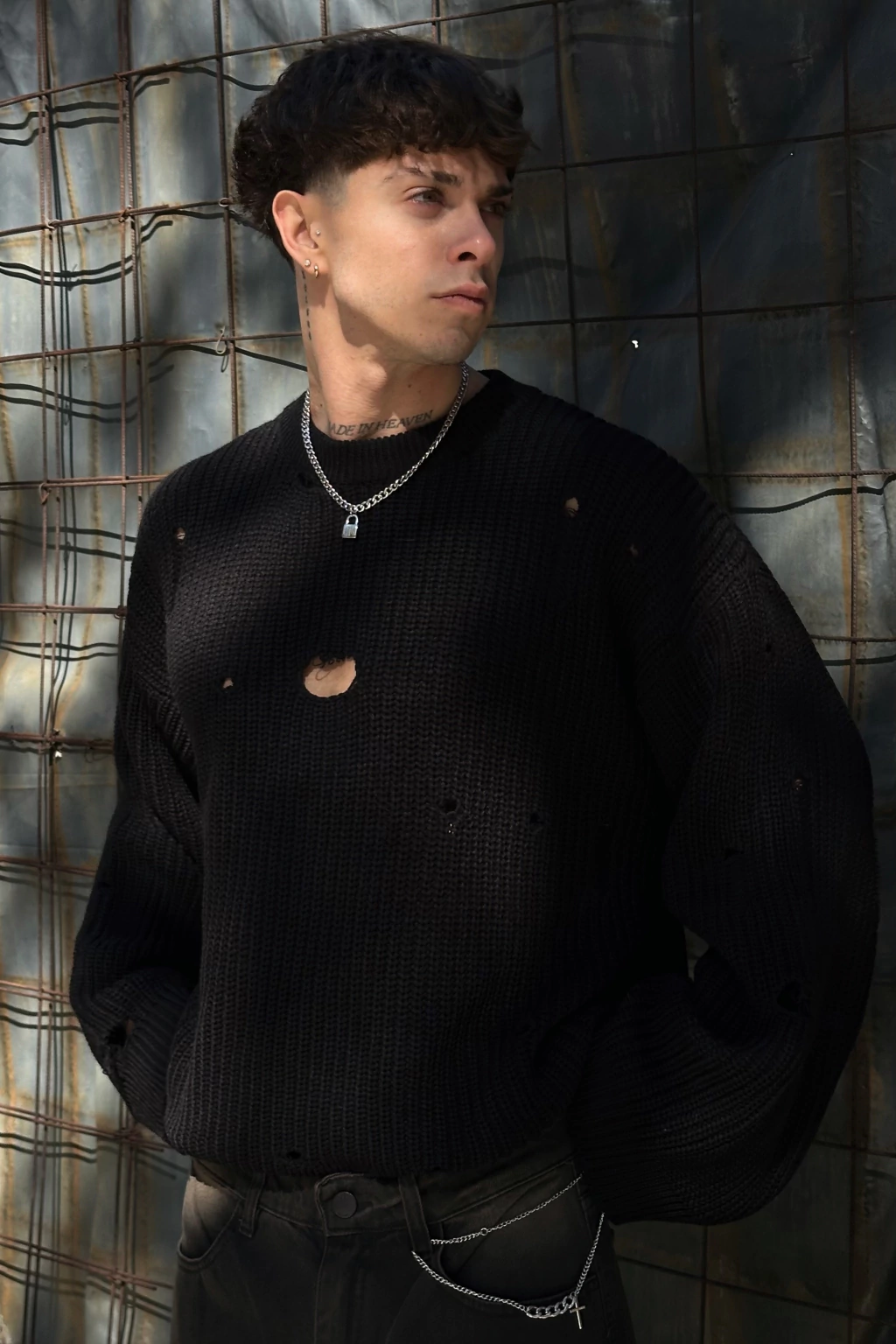 Sweater over con detalles de rotura, y agujero en el pecho.